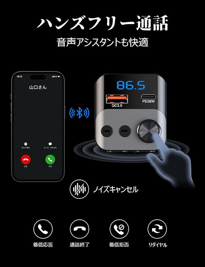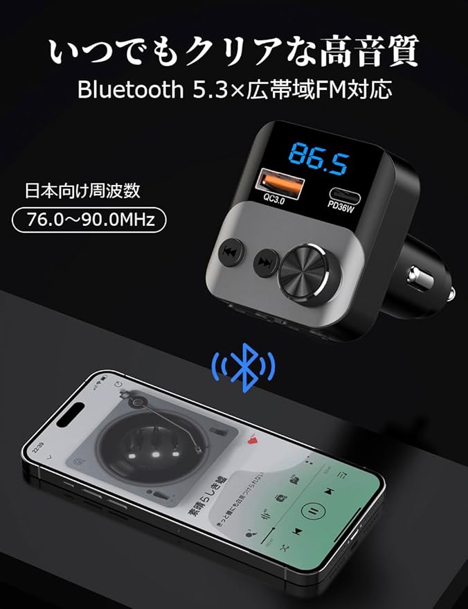 【Bluetooth5.3 広帯域FM|いつでもクリアな音質】☑☑最新Bluetooth5.3チップにより、接続安定性・通信速度・低遅延性能がさらに進化。76.0〜90.0MHzの広帯域に対応し、地域や状況に応じて最適な周波数へ簡単切替可能。FM干渉を回避しながら、通話・音楽・ナビも常にクリアな音質で再生。