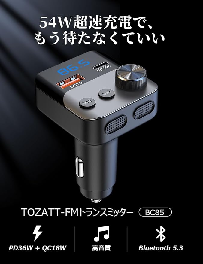 TOZATT【54W超高速充電&Bluetooth5.3搭載】 FMトランスミッター Bluetooth 車載 ハンズフリー通話 QC3.0/PD3.0対応 カーチャージャー シガーソケット 12V/24V対応