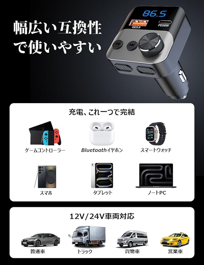 【業界最強クラスの急速充電54W対応】☑☑PD3.0ポート(最大36W)+QC3.0ポート(最大18W)の2ポート搭載カーチャージャー。iPhoneやAndroidスマホはもちろん、タブレットや軽量ノートPCまで幅広く対応し、走行中も快適に超高速充電。☑☑シガーソケットに挿すだけで、FMトランスミッターとしての便利さも一台に集約。ドライブ中もバッテリー残量の心配なし。