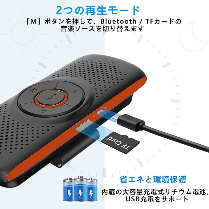 【長い待機時間】この車用Bluetoothスピーカーは、リチウム電池を内蔵し、満電状態で通話期間は約15~17時間です。type-cケーブルで本機を給電します。車中にUSB充電器を使って充電できます。取り付けは簡単です。本機を携帯に接続して、本体は付属のクリップを使って車のサンバイザーに取り付けるだけ。連結がしっかりしていますので、運転中に落下する心配はありません。
