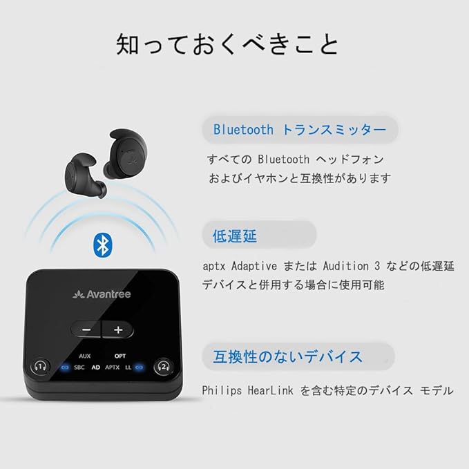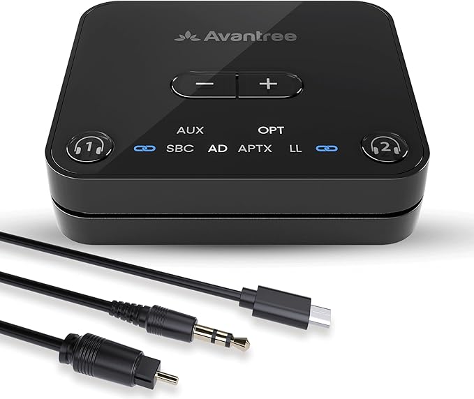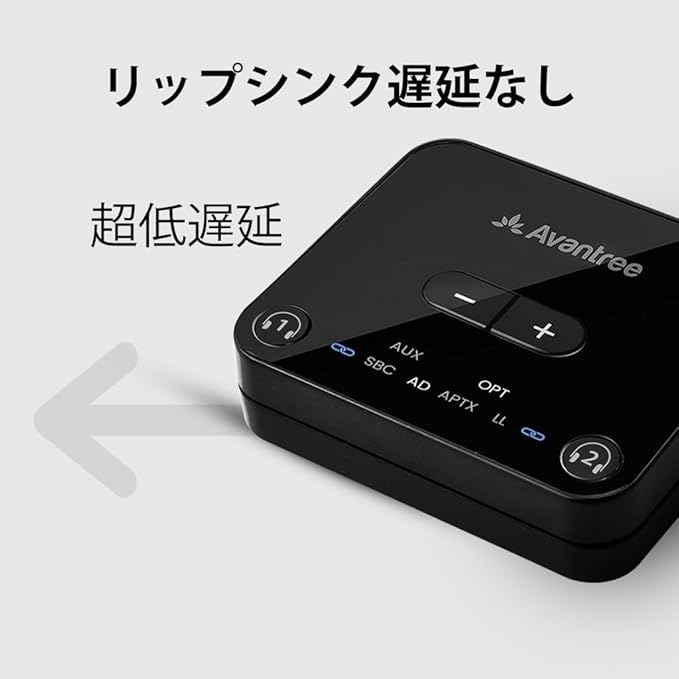 Avantree Audikast 3 - aptX Adaptive 対応 Bluetooth 5.3 トランスミッター(TVオーディオ用)、光およびAUX出力対応、デュアルヘッドフォン接続、最大30mの通信範囲