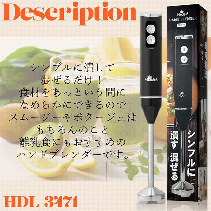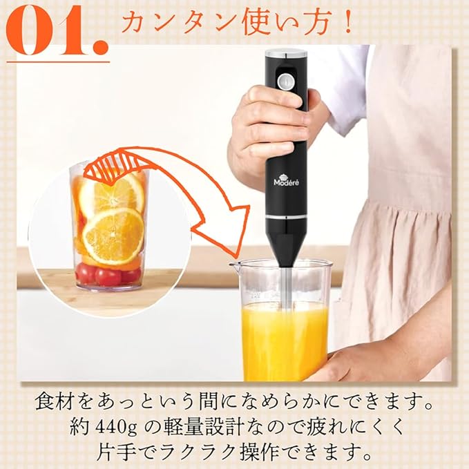 カンタン使い方! 食材をあっという間になめらかにできます。 約440gの軽量設計なので疲れにくく 片手でラクラク操作できます。