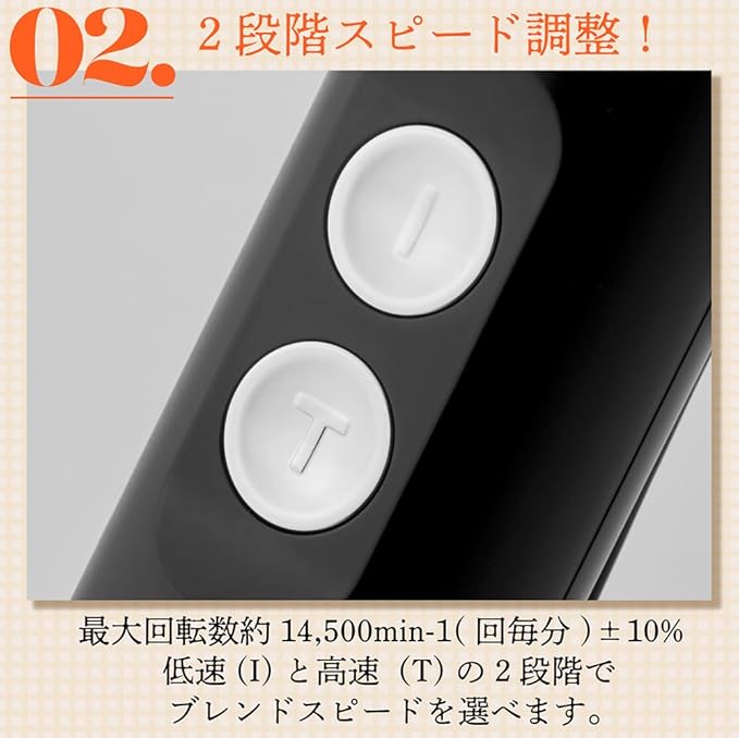 2段階スピード! 最大回転数約14,500min-1(回毎分) 10%! 低速(I)と高速(T)の2段階で ブレンドスピードを選べます。