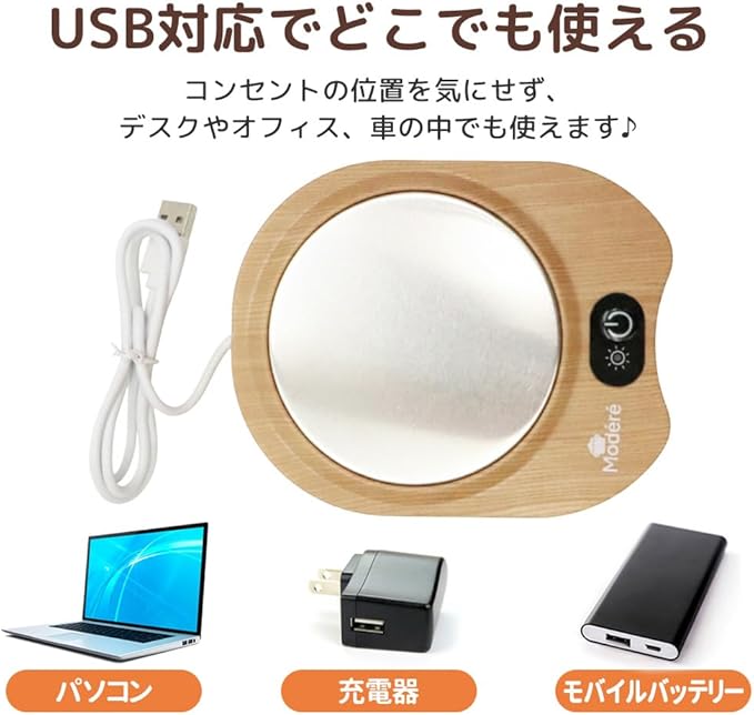 USB対応なのでオフィス、会議室、デスクなどどこででも飲み物の温かさをキープできます。