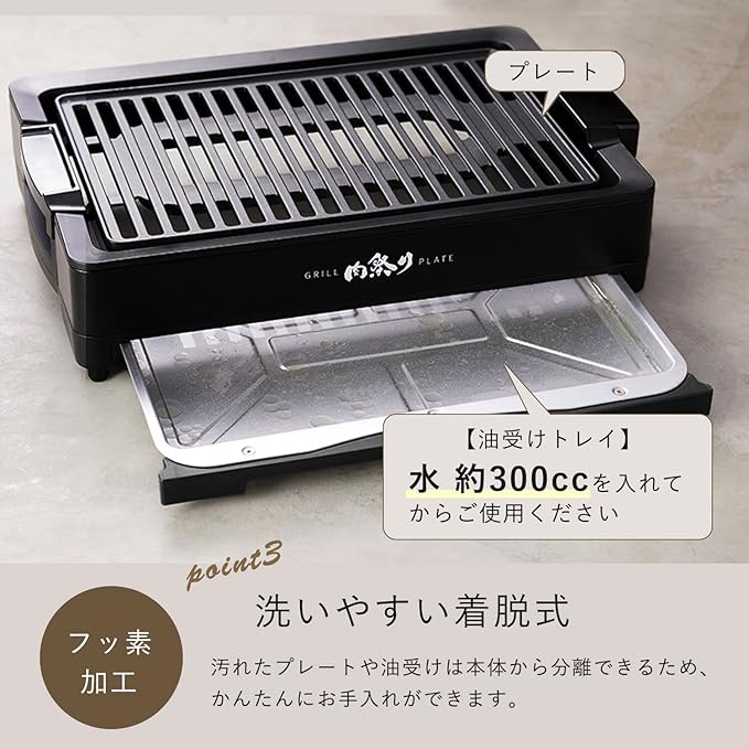 焼肉屋のグリルホールを再現した特別なプレート!一般的なホットプレートと比べるとスリット穴がないため、余分な脂を落とすことで煙が出にくくなります。室内でもスモークレスで本格的な焼肉を楽しめます。※ご使用前に油受けプレートに水約300ccを入れてください。