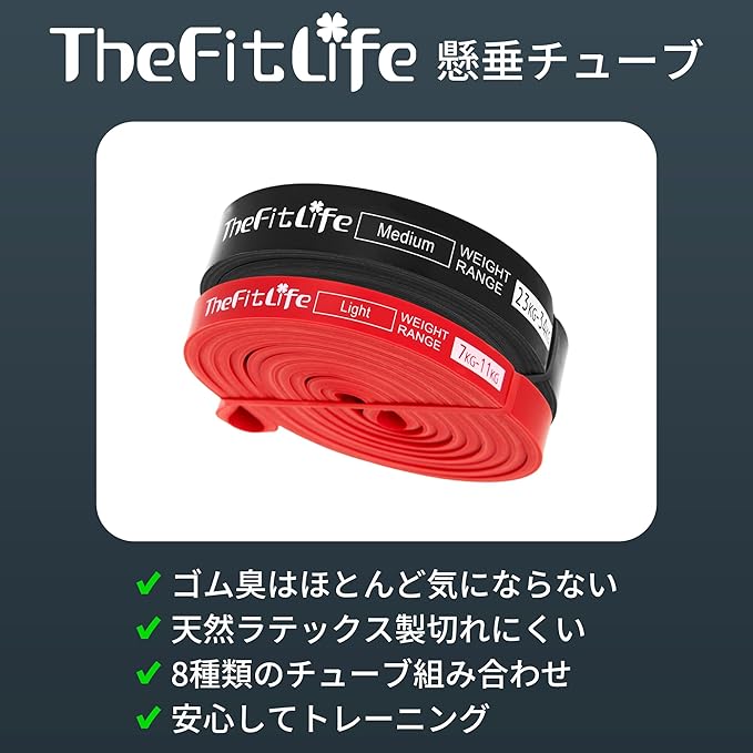 【懸垂補助に使える】:TheFitLifeトレーニングチューブを持っていれば、普段懸垂が不得意な初心者でもゴムチューブで体を支えることで、効果的にトレーニングできます。ご自分にあった負荷力のゴムチューブを選んで懸垂にトレーニングしましょう。【ご注意】レッド、ブラックのチューブは懸垂用ではりませんのでご注意ください。ストレッチを行う場合はレッドのチューブをお使いください。