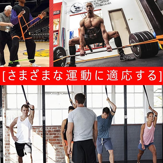 【5階段負荷のレジスタンスバンド 最大負荷67kg調整可能】:緑(6.7-13kg)、黄(18-31kg)、オレンジ(27-45kg)、赤(31-54kg)、黒(36-67kg)あなたは絵の指導と個人的な訓練のに基づいて適当なレジスタンスバンドをお選びください。全身トレーニングには、黄・オレンジ・赤のセットをおススメ。腕や肩のストレッチトレーニングためにはライトレジスタンスチューブをおススメ。足のスクワットまたは引き上げの高難度なトレーニングにはより強いレジスタンスチューブにおススメ