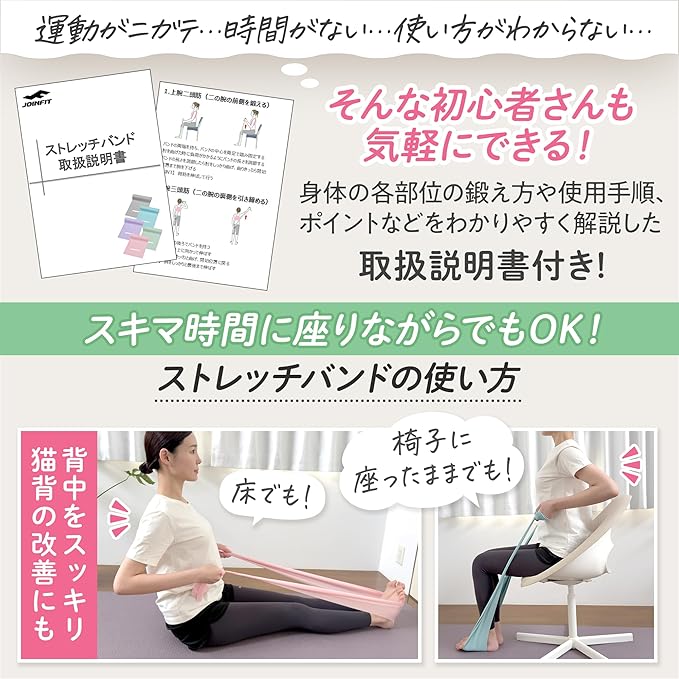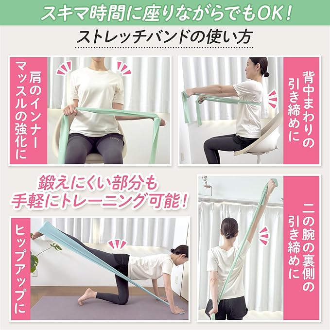 【使用方法】身体を伸ばすサポートやポーズを安定させる役割、ゴムの伸縮制の抵抗力を活かして負荷をかけるトレーニングなど、様々な使用方法があります。猫背などの姿勢の強化して体幹を鍛える、インナーマッスルを刺激してシェイプアップする、肩甲骨などの肩回りを鍛えるなど、ボディメイクに最適です。