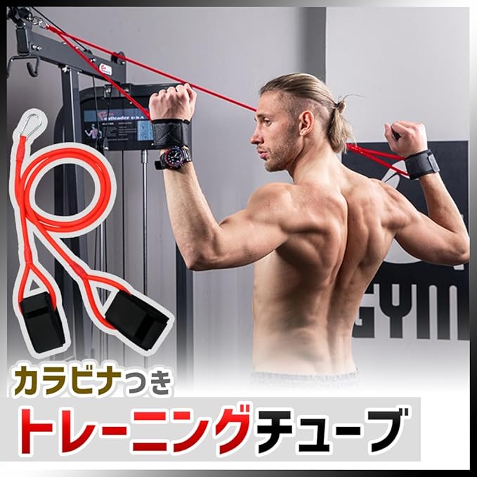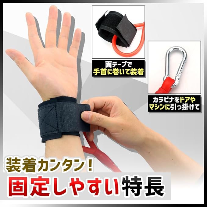 使い方は先端のカラビナをポールやトレーニングマシーンなどに引っ掛けて固定し、手首にバンドを巻き付け何回も引っ張るだけ!シンプルな運動だけで手軽に身体を鍛えられるので、初心者からプロの方までどなたでもお使いいただけます。