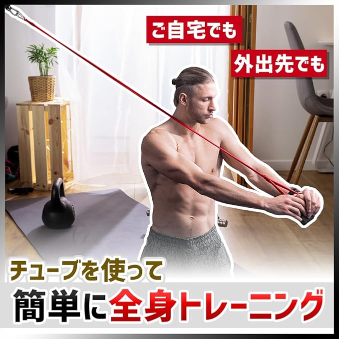 自宅はもちろん、ジムやスポーツセンターなどに持ち運んでどこでも筋肉を鍛えられる筋力トレーニングチューブです。本体は伸縮性に優れており様々な動きやポジションに対応しているため、思い通りのトレーニングを実現できます。