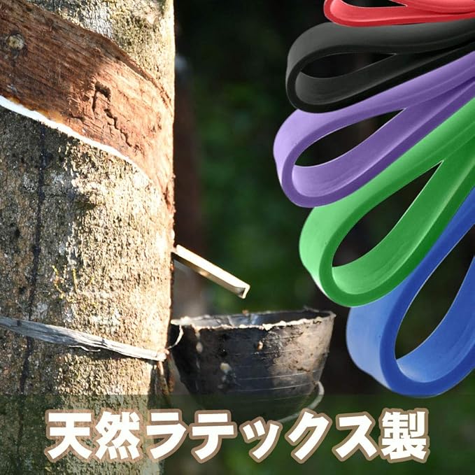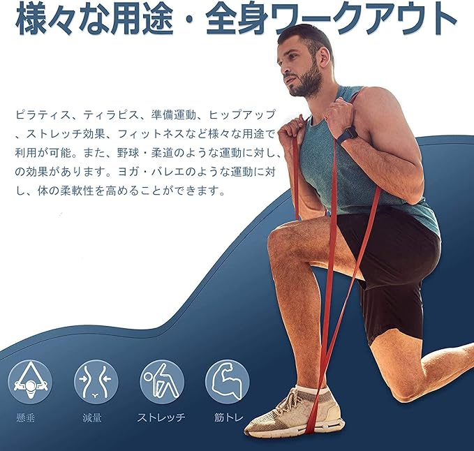 【5種類の強度】レッド(負荷レベル:約7-15kg)、 ブラック (負荷レベル:約15-30kg)、 パープル (負荷レベル:30-45kg)、 緑 (負荷レベル:45-70kg)、 青い (負荷レベル:70-90kg)の5種類。トレーニングに合わせて強度を選べる。