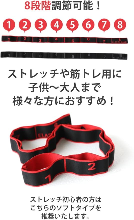 カラー レッド/ブラック サイズ 長さ:約89.5cm/幅:約4cm 素材 ナイロン、ゴム糸 製造 中国製 商品説明 筋トレや柔軟ができるストレッチバンドです。肩、腕、ヒップ、足、背中など幅広く全身の筋肉にアプローチ可能です。 8段階に仕切りがあるので、子供~大人の方まで幅広くお使いいただけます。ストレッチ初心者の方にもおすすめです。 様々なポーズの練習用に! 長さ調整で負荷を変えることもできます。 丈夫さと耐久性を兼ねた素材です。 伸縮性があり長期の使用でも問題ありません。 コンパクトで軽く、丸めてどこにでも持ち運びが出来ます。 バレエ、ヨガ、体操、新体操、ピラティス、ウォームアップなど様々なストレッチ運動に最適です。