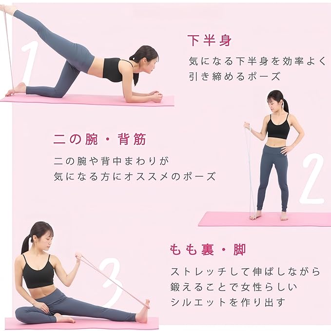 特徴:br > 1.ハンドルには丸い滑り止め加工が施されており、持ちやすく、汗をかいても滑りにくく、br > 2.チューブは高品質なシリコン製で、伸縮性がありながらも破れにくいチューブ設計を採用。一体成形されており、10,000回以上の高強度引張試験に合格してるトレーニングチューブで、繰り返しの筋トレやストレッチ使用にも耐えるので、長く愛用できます。br > スペックです:br > 材質です:シリコーンbr > 色です:ピンクbr > パッケージ内容です。ヨガストレッチベルトは*1br > 備考ですbr > 手動測定により、サイズと重量に一定の誤差がある場合があります。