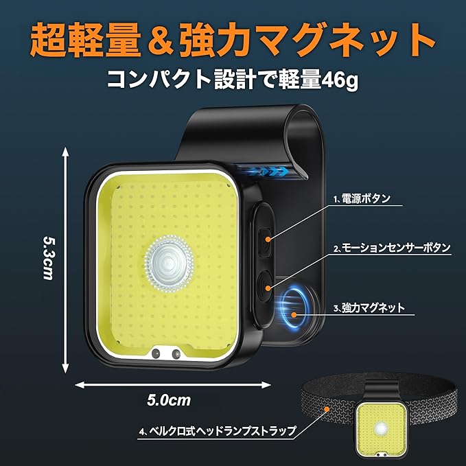 【超軽量&強力マグネット&ベルクロヘッドバンド】 重さわずか46g、サイズは5.3 5cmと、羽のように軽量なランニングライトです。マグネットクリップにより、襟元、ベルト、バックパック、帽子などに簡単に装着でき、さまざまな装着方法が可能です。付属のバンドを使用すれば、アームバンド等様々な用途にも使用でき、ランニングや作業、釣りにも最適。 ヘッドバンドの高弾性により、どんな頭のサイズにもフィットし、快適に装着できます。また、取り外し可能なマグネットにより、鉄製の表面に直接取り付けることも可能で、便利なハンズフリー操作を実現します。
