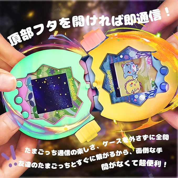 【ケースを外さずに、簡単に通信・インタラクション】トップ開き構造を採用したため、保護ケースを装着したまま、他のたまごっち機種と通信してインタラクションすることができます。ケースを取り外す手間が省け、機能操作に一切影響がなく、よりスムーズに楽しめる使い勝手です。