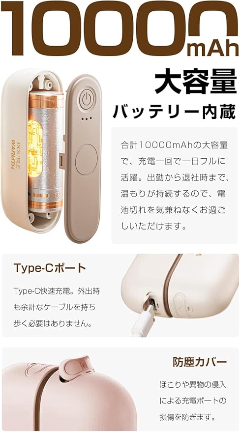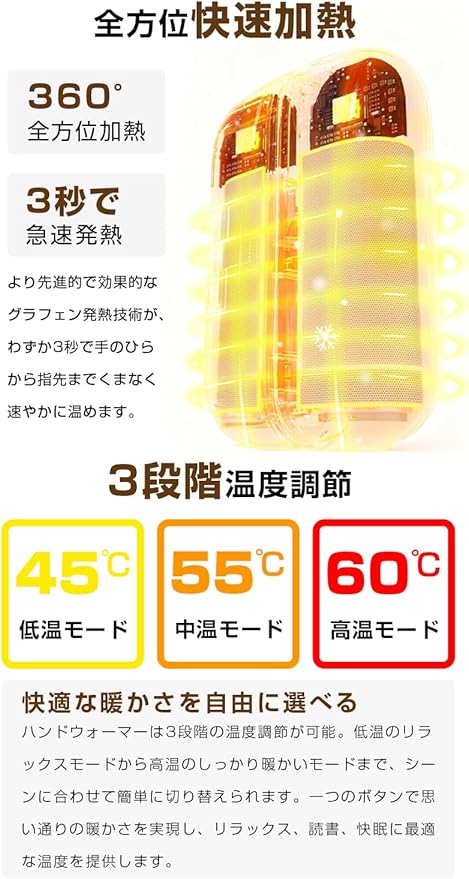 【10000mAh大容量バッテリーで長時間持続】本製品は合計10000mAh(5000mAh 2)の大容量バッテリーを搭載しており、フル充電すれば長時間の連続使用が可能です。目安として、低温モードは約7〜14時間、中温モードは約5〜7時間、高温モードは約4〜6時間お使いいただけます(※周囲温度やご使用状況により前後します)。朝の通勤・通学から仕事中のデスクワーク、夕方の帰宅、さらには週末のレジャーや屋外イベントまで、一日を通してしっかりと手元をあたためてくれる心強いスタミナ設計です。「そろそろ電池が切れるかも…」という不安を減らし、寒い季節のお出かけをより快適にサポートします。