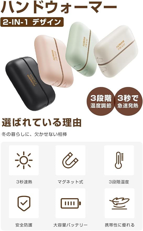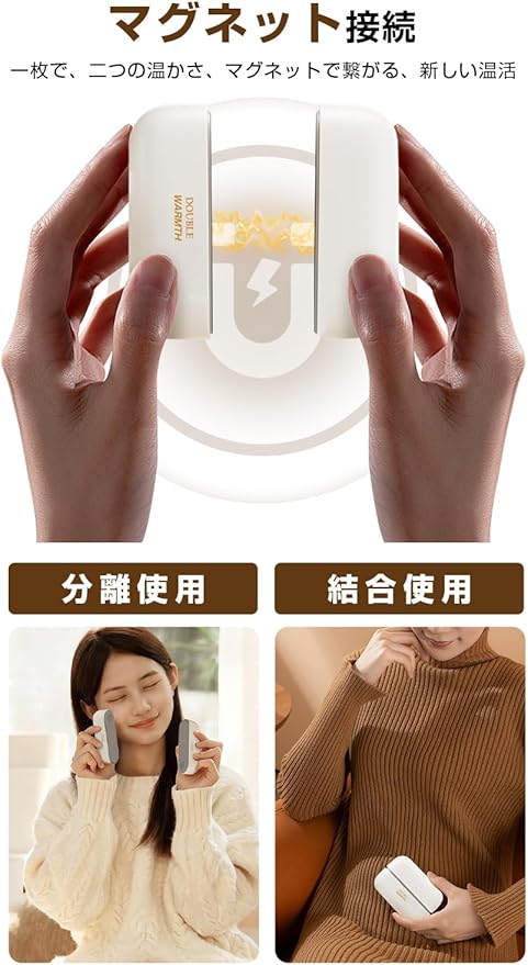※ご注意:パッケージに記載されている「2024」は製品番号であり、年を指すものではありません。【磁気分離式デザイン・両面大面積発熱】 革新的な磁気分離式充電カイロを実現!単独で使用する場合は、一方で手を温めながら、もう一方で他のデバイスを充電できます。外出時には友達やパートナーとシェアして共同使用したり、一方だけを持ち歩いて単独使用したりも可能です。また、アップグレードした本体は両面が同時に発熱し、大面積の暖かさを提供。分割してコートの 2 つのポケットに入れれば、冬のアウトドア活動や寒い朝の通勤・通学に非常に適しています。このカイロがあれば、どんなに外が寒くても、冬じゅうあたたかく過ごせます。※ご使用のヒント※磁力は強力タイプではありません。組み合わせてご使用の際は、左右を一緒に持つことで、より快適にお使いいただけます。