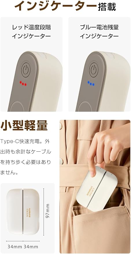 【超軽量ポケットサイズ&手に馴染む上品デザイン】1台あたりわずか約101g、サイズは約97 29 34mmの超軽量コンパクト設計。手のひらにすっぽり収まり、ポケットや小さなバッグにもスマートに収納できます。高品質なABS+PC樹脂と合金パーツを組み合わせたマットな質感が、上品でモダンな印象を演出。豊富なカラーバリエーションで、カジュアルからきれいめコーデまで幅広いスタイルにマッチします。実用的なあたためグッズでありながら、“冬のアクセサリー”感覚で持ち歩けるデザインなので、自分用にはもちろん、センスの良いギフトとしても喜ばれる一台です。旅行・通勤・通学・アウトドアなど、寒さが気になるあらゆるシーンで手軽にお使いいただけます。