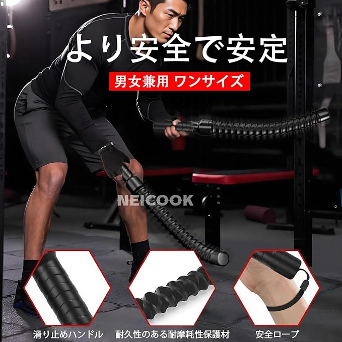 ✔️【耐久性のある素材】このコードレストレーニングロープは高強度スチール製で、優れた靭性と弾力を兼ね備えています。さらにシリコンカバーが錆を防ぎ、長期間使用しても変形しにくい設計。トレーニング効果を最大化する耐久設計を実現しました。表面はチップに強い加工でキズや剥がれにも強く、長期間美しさを保ちます。着脱式のシリコンヘッドで家具や壁も傷つけません。