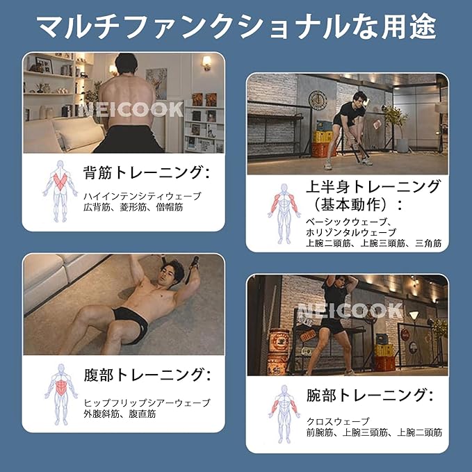 ✔️【筋力トレーニングに必須】このコードレスバトルロープは、腕・胸・背中・脚まで全身を鍛えるように設計されています。筋力トレーニング、持久力向上、HIIT(高強度インターバルトレーニング)など、あらゆる目的に対応。コンパクトなデザインながら、多機能なトレーニングツールとして、どこでも効率的な全身運動を実現します。