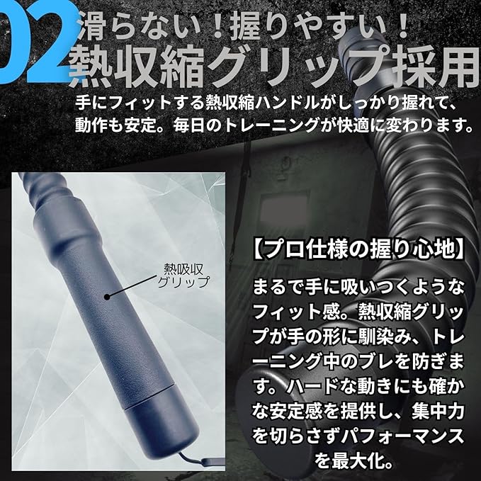 ✅【ロープレスでもパワフル!新感覚の筋トレツール】 この製品は、スチール構造により強靭な耐久性を実現。さらに、熱収縮グリップで滑りを防ぎ、快適な持ち心地を保ちながらワークアウト可能。ダイナミックな動きで全身の筋肉を刺激し、筋力強化、有酸素運動、格闘技系トレーニングなど、幅広い目的に対応します。