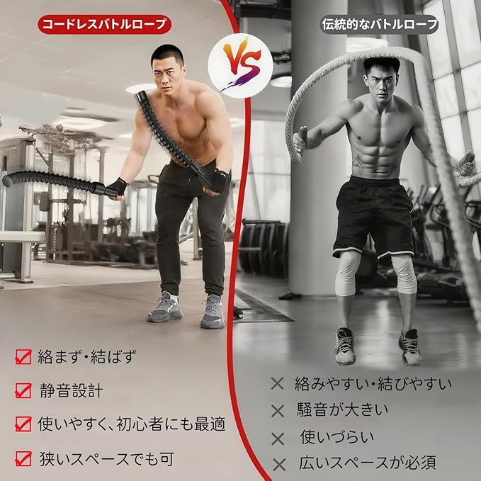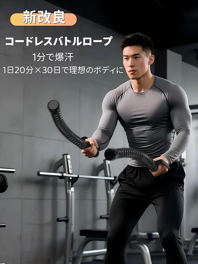 この革新的なコードレスバトルロープは、従来のロープトレーニングの動きを再現しつつ、ロープの絡まりや床への騒音といった煩わしさを解消しました。初心者の方でも簡単に使いこなせる設計です。