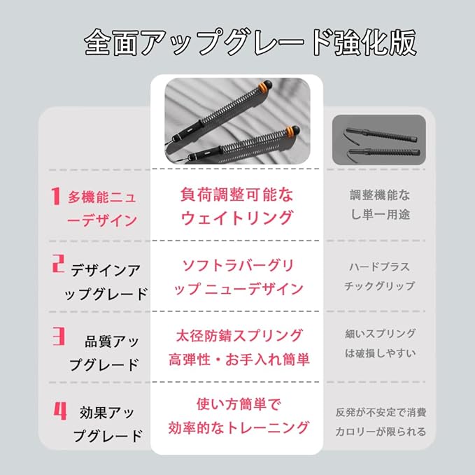 【革新設計コードレスバトルロープ】この革新的なコードレスバトルロープは、従来のロープトレーニングの動きを再現しつつ、ロープの絡まりや床への騒音といった煩わしさを解消しました。初心者の方でも簡単に使いこなせる設計です。当社のホームフィットネスロープは、弾性スプリングを採用し、毎日のエクササイズを最大限に活用できるよう設計されています。コンパクトな44cmサイズながら、本格的なロープウェーブ運動を可能にし、マンションやホテル、小さなホームジムでも周囲に気兼ねなくトレーニングできます。静粛が求められる空間にも最適です。