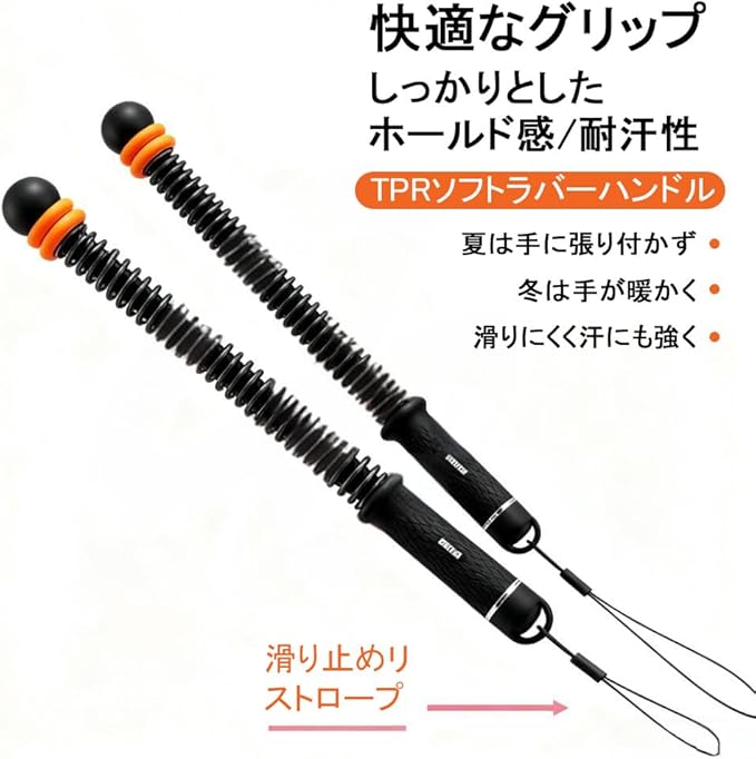 【滑り止めグリップ】ハンドルはテクスチャ加工されたシリコン製で、汗をかいても滑りにくいグリップを維持します。リストストラップと滑り止めグローブも付属しており、誤って落としてしまうのを防ぎ、自宅でのトレーニング中の安全性を高めます。