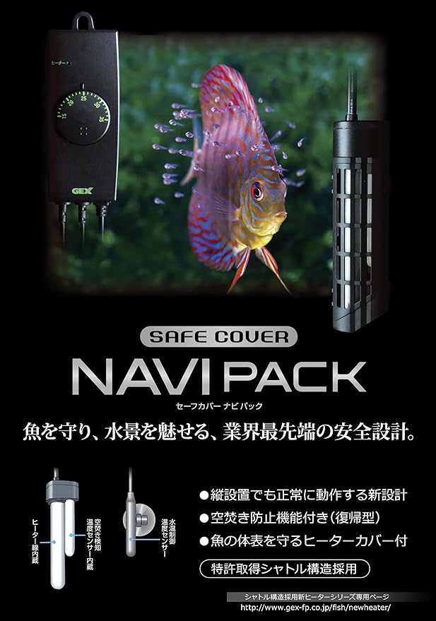 ※本製品は必ずサーモスタットに接続してご使用下さい。 安全を追求した独自の【シャトル構造】を採用。 空焚き検知温度センサーを搭載、空気中での通電を感知するとヒーターカバー表面温度を安全な温度にコントロールします。 温度ヒューズを作動させる前に通電を遮断するので、再使用が可能です。 難燃性樹脂を使用したヒーターカバーがついているので、人にも、魚にも安全です。