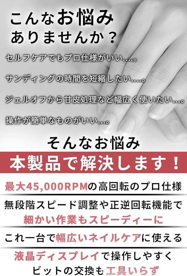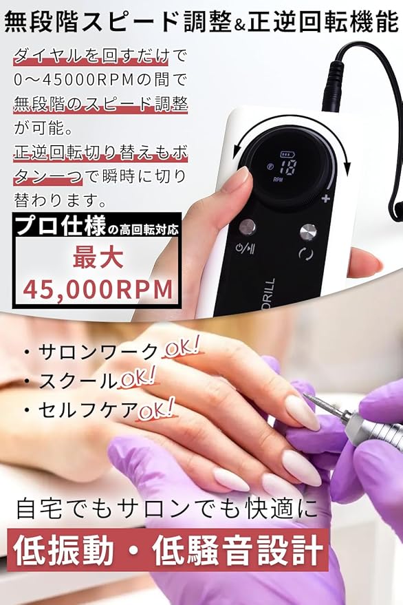 液晶ディスプレイや低振動・低騒音設計を採用し、ジェルオフから甘皮処理、スカルプ施術まで幅広く対応可能な1台。