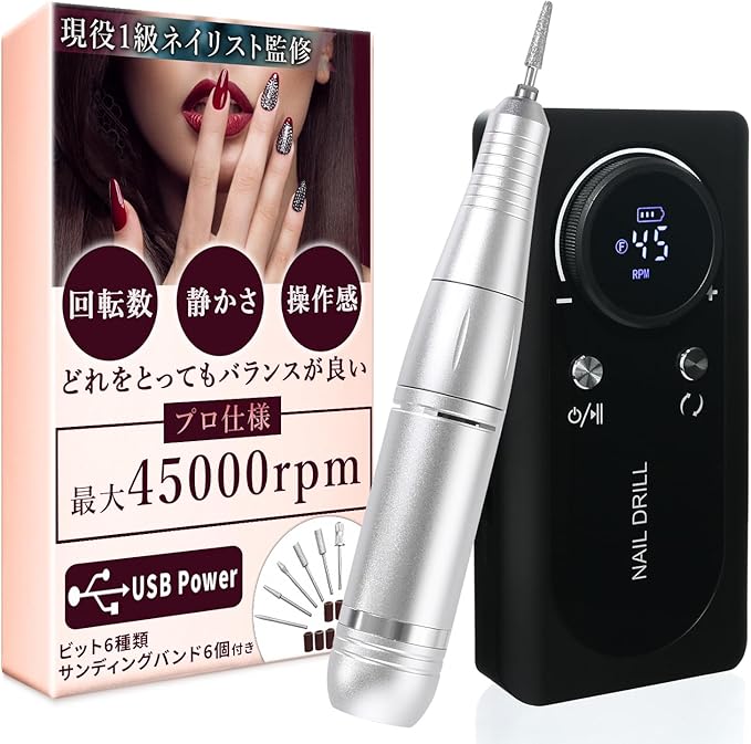 「Dawnlord」製のネイルマシンは、最大45,000RPMの高回転とコードレスの利便性を兼ね備えたプロ仕様のモデルです。