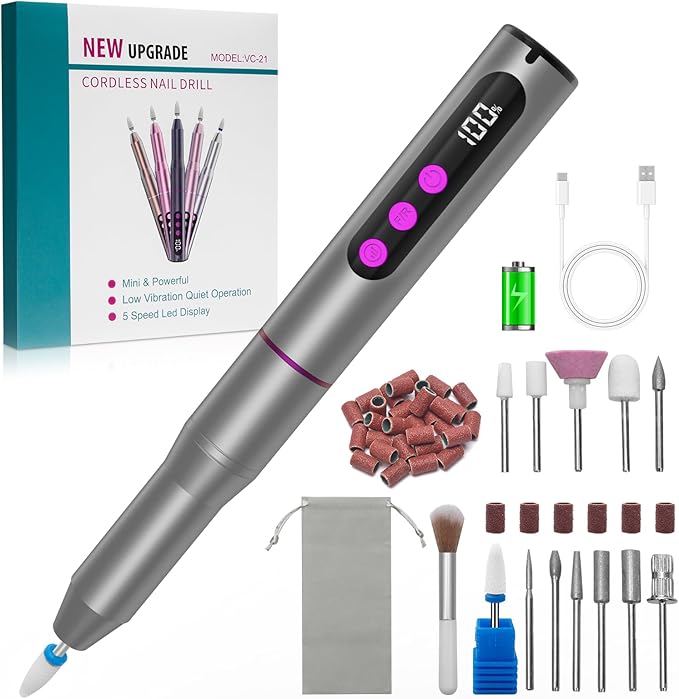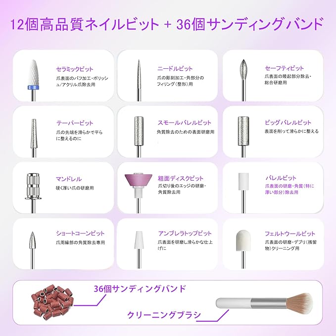 【アップグレード版】CGBEの新アップグレード版ネイルマシンは、LCDディスプレイと5段階のスピード調整機能を備え、まるでサロンのような仕上がりをご自宅で実現します。セット内容:12種類のビット、36個のサンディングバンド、ブラシ、収納袋、USB充電ケーブル。1つのセットですべてのネイルケアニーズに対応します。※ビット径は2.35mm 軸径で、本製品に対応しています