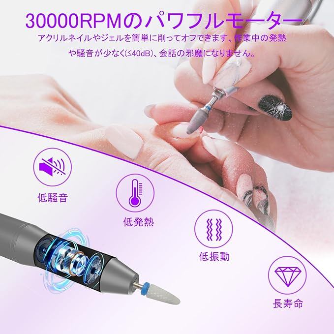 【低振動・低騒音・低発熱】本ネイルマシンは、最新の強力で静音性に優れたモーターと精密設計のベアリングを採用しており、最大回転数は30,000rpm、力強く安定した出力で、振動を抑え、騒音(≤40dB)も低く、熱も発生しにくいため、快適かつ効率的なネイルケアを実現します