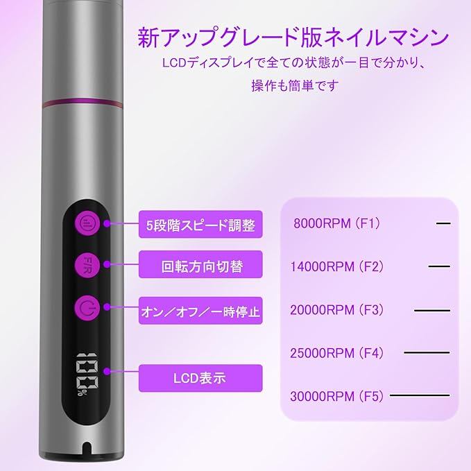 【LCDディスプレイ&5段階スピード調整】ネイルマシーンにはLCDディスプレイが搭載されており、作動状況、回転速度、回転方向、バッテリー残量を一目で確認できます。速度は8,000~30,000rpmの5段階で調整可能。さらに、一時停止機能やF/R(正転/逆転)切替機能も備えており、右利き・左利きどちらの方にも快適にお使いいただけます。プロのネイリストから初心者まで幅広く対応する設計です