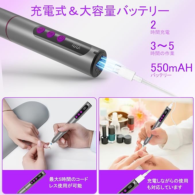 【コードレス充電式ネイルマシン】このコードレス電動ネイルマシンは、高性能バッテリーを搭載しており、約2時間の充電で最大3~5時間の連続使用が可能です。頻繁な充電の必要がなく、長時間の使用でも安心です。また、必要に応じて充電しながらの使用も可能なため、作業を中断することなくネイルケアを続けられます