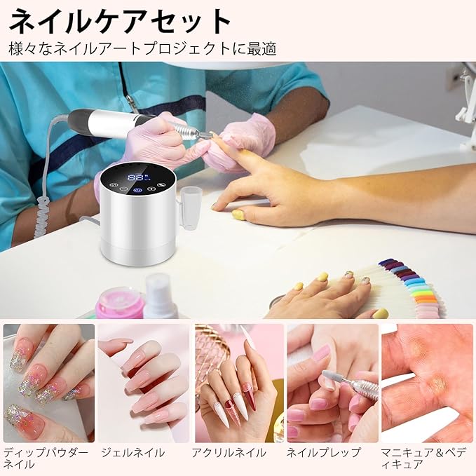 サロン&家庭用に最適:セット内容:ネイルマシン本体 1、ハンドピース 1、接続ケーブル 1、ネイルビット 6、サンディングバンド、取扱説明書。このプロ仕様の電動ネイルマシン は、家庭用にもサロン用にも適しています、ポリネイルエクステンションジェルやビルダーネイルジェルを素早く除去でき、6つのドリルホルダーを備えて作業効率を高めます。