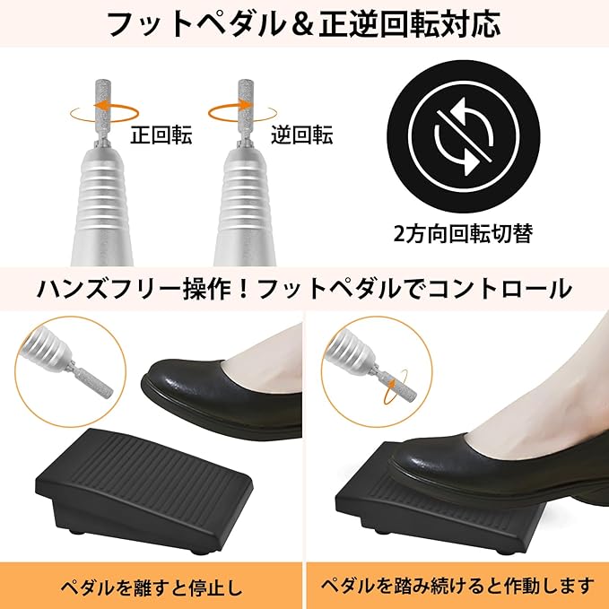 フットペダル&正逆回転対応:本電動ネイルマシンは、ボタン操作でビットの回転方向を切り替えることができ、右利き・左利きどちらにも対応しています。「HANDモード」と「FOOTモード」を切り替えスイッチで選択可能。フットペダルでドリルの動作をコントロールすることで、作業効率を上げ、疲労を軽減します。