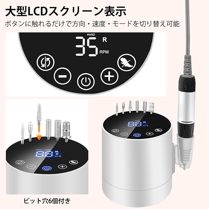 Diesisa ネイルマシン プロ用: 電動ネイルオフマシーン LCDデジタル表示搭載 35000 RPM 正逆回転 6個セット ジェル除去/甘皮処理/爪磨き/ネイルケア全対応 家庭用 初心者 セルフオフサロン適合