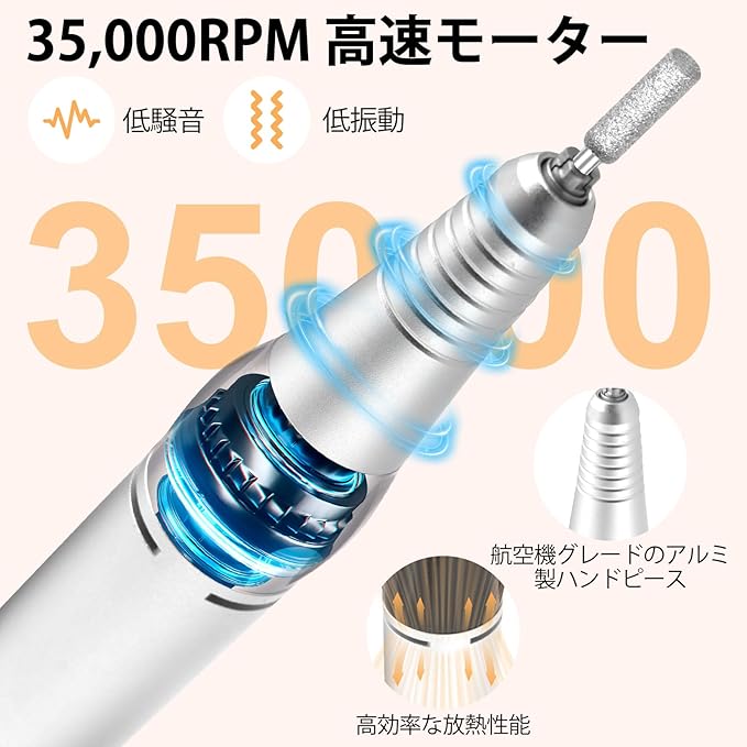 強力モーターネイルマシン:Diesisaのネイルマシンは、高精度・高トルクを備え、最大回転数は35,000RPMに達します。低騒音・低振動を実現し、安定した使用感を提供します。ハンドピース外部には通気孔が設計されており、高速回転時でも過熱を防ぎ、製品寿命を延ばします。