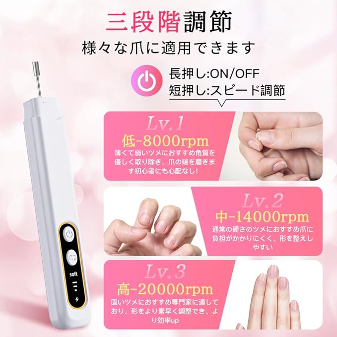 「三段階調節 & 最大20000rpm」:電動ネイルマシンは高品質の強力なモーターを搭載しており、最大20000rmpの高出力に達することが可能です。低速8000prm、中速14000prm、高速20000prmの三段階調節あり、回転数を調整することで削り過ぎを抑えます。また、左右両方向に回転できるため、利き手を問わず快適に作業できます。