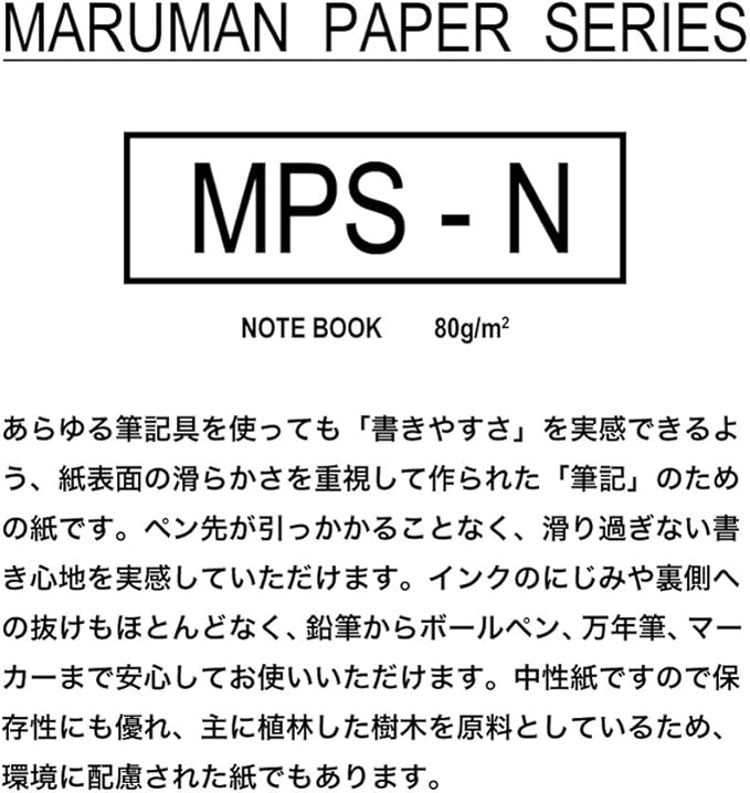 筆記用紙は、マルマンルーズリーフ共通の80g/m2を使用、あらゆる筆記具を使っても「書きやすさ」を実感できるよう、紙表面の滑らかさを重視して作られた「筆記」のための紙です。ペン先が引っかかることなく、滑り過ぎない書き心地を実感していただけます。インクのにじみやウラ側へのインクの抜けもほとんどなく、鉛筆からボールペン、万年筆、マーカーまで安心してお使いいただけます。中性紙ですので保存性にも優れ、環境にも配慮された用紙です。