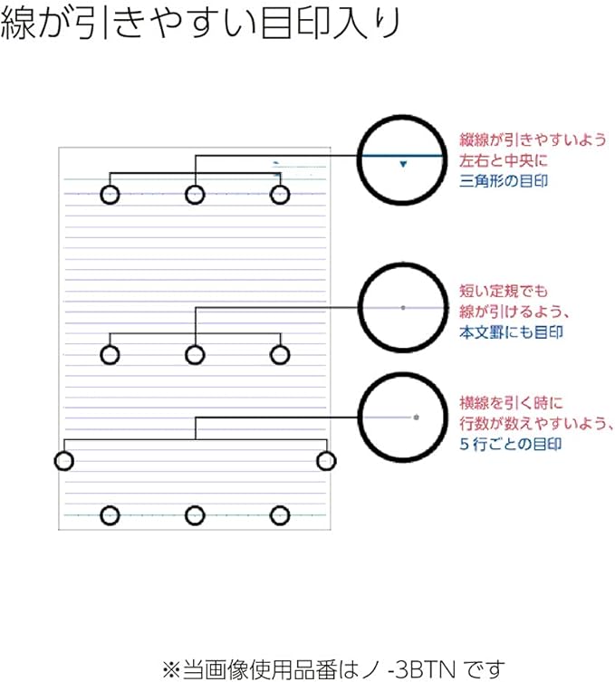 使いやすく工夫した罫内容/キャンパスノートと同じようにタテ線が正確に引けるよう、センターと左端に三角形のメモリ点を配置しました。