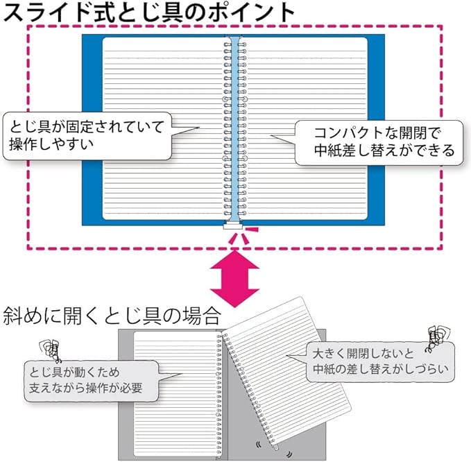 ●ワンタッチの静かな開閉。とじ具が広く開くので中紙のセットが簡単です。