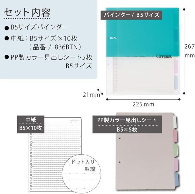 ●セット内容/中紙10枚(ノ-836BTN/B5サイズ)・PP製カラー見出しシート5枚(B5サイズ)