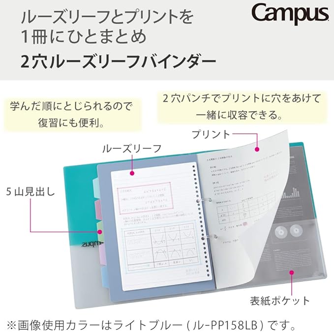 ・2穴パンチで穴をあけたプリントとルーズリーフをまとめて1冊に、収容できます。