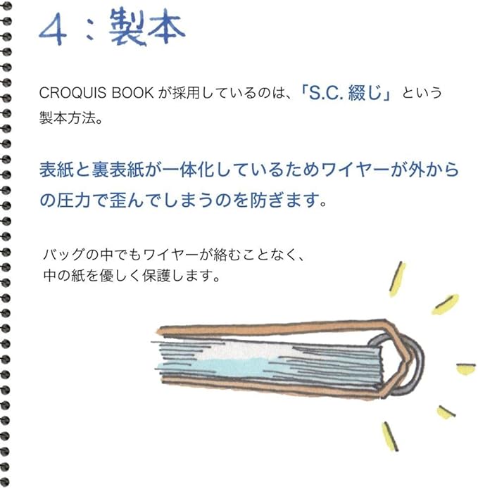 ・バックの中でもワイヤーが絡まないS.C.綴じ製本。<
