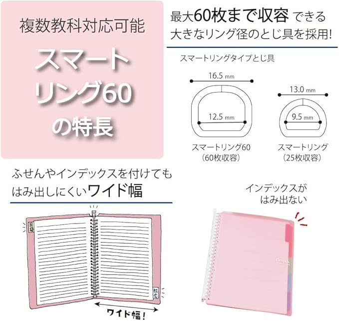 ・最大60枚収容できるリング径のため、インデックスを付ければ複数教科にも対応が可能となります。