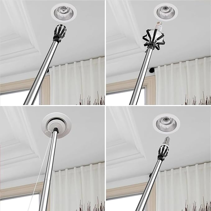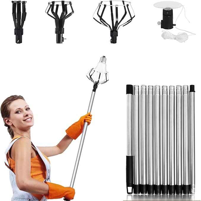 【高所電球交換棒】電球チェンジャーは10*棒、1*大きい8指おり、1*中型8指おり、1*小さい8指おり、1*吸引のコップを含んでいる(吸引のための吸引のコップは平らな、乾燥した、きれいな表面を要求する)。ほとんどの電球タイプに適合するよう設計されており、3つの交換可能なアダプターヘッドがあり、毎日の電球交換のニーズに十分応えます。