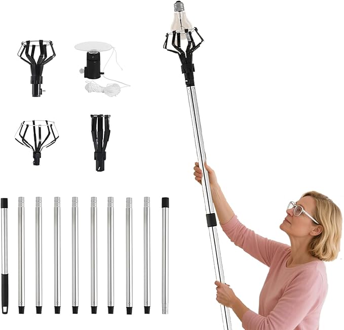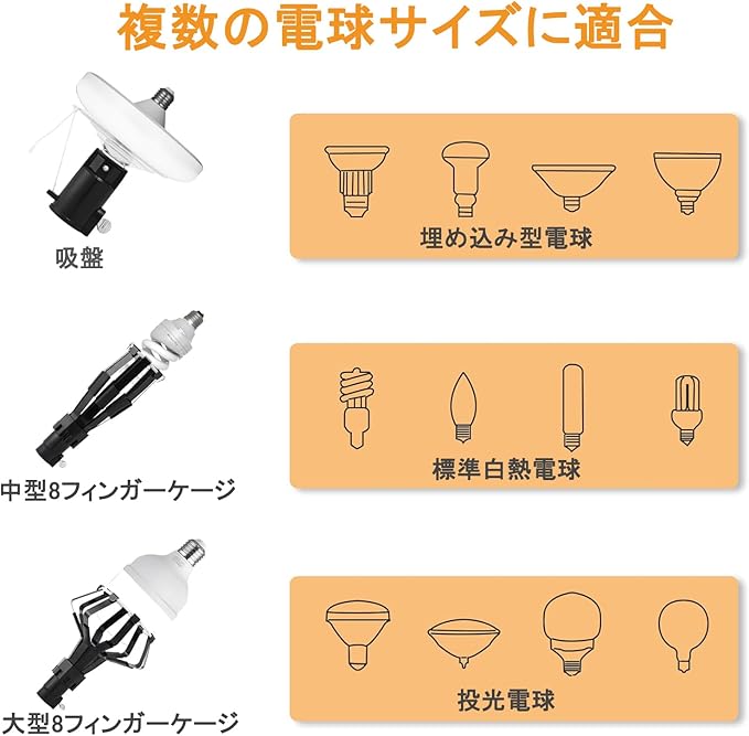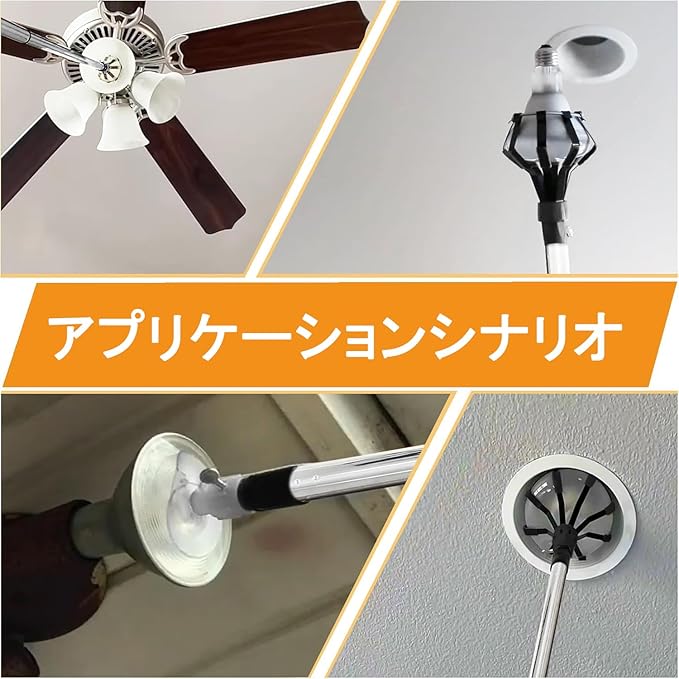 【充実の電球交換セット】高所用電球交換セットには10本のロッドに加えて、大型・中型・小型の8本指キャッチユニットと吸盤ユニットが含まれています。4種類の交換可能なアタッチメントで、ほとんどの電球タイプに対応します。日常の電球交換ニーズを充分に満たす設計です。
