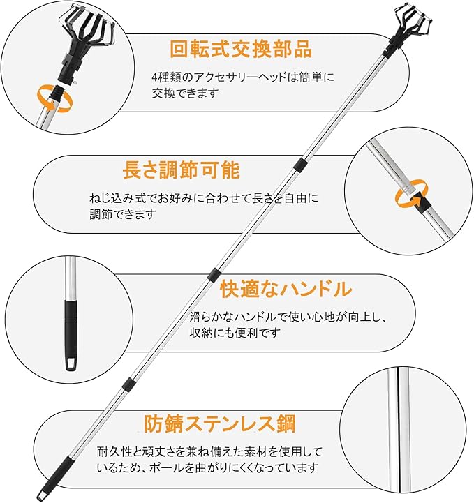 【規格統一の互換性設計】ロッド先端は標準の3/4インチネジ仕様を採用しています。当社の電球交換チェンジャーはもちろん、天井作業ツールや果実収穫機など、様々な互換アクセサリーとの連携が可能です。多目的な使用シーンに対応します。